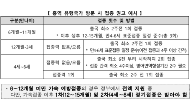 시기: 여행 전 예방접종은 최소 2주 전에 완료하는 것이 좋습니다. 특히 홍역이 유행하는 지역으로 여행을 계획 중이라면, 출국 전에 반드시 홍역 예방 접종을 받는 것이 필요합니다.